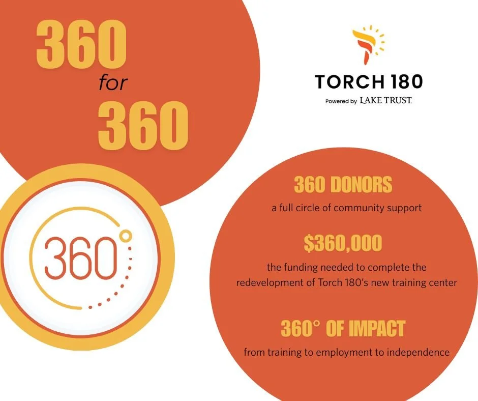 360 for 360 campaign - we need to raise $360,000 for the buildout and renovations for the retail space. We are looking for 360 supporters to each donate $1,000 to help us reach our goal.